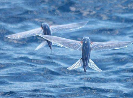 http://www.sarayanews.com/image.php?...1929d47f&size= : - في سابقة هي الأولى من نوعها، انفرد التليفزيون الياباني بتصوير السمك الطائر أو الطيار، وهو يطير فوق سطح المياه قبالة ساحل جزيرة ياكوشيما. السمك الطائر هو نوع من الأسماك يقذف نفسه من الماء بحركة من ذيله القوى وينزلق في الهواء، بحيث يمد زعانفه الكبيرة التي تعمل كجناحين للطيران، للهروب من أعدائه الذين يُطاردونه في البحار وعلى رأسهم الإخطبوط. هذا النوع من السمك، يعيش في قُرب سطح البحر بالبحار الدافئة مثل البحر الأبيض المتوسط، ويبلغ متوسط طوله 45 سم، فيما تشبه زعانفه الأجنحة ويطير مدة تقرب من 45 ثانية بعدها يدخل الماء للحصول على الأكسجين. ويتم الاستعانة بالسمك الطائر في اليابان والهند والصين وإندونيسيا على موائد الطعام، وقد يستخدم أيضاً في صنع السوشي، ويُعد جزء من الشعار الرسمي لهيئة السياحة في بربادوس، بالإضافة إلى رسمه على القطع الفنية والعملة النقدية للبلاد. http://www.sarayanews.com/image.php?...798&size=large http://www.sarayanews.com/image.php?...3fc&size=large |